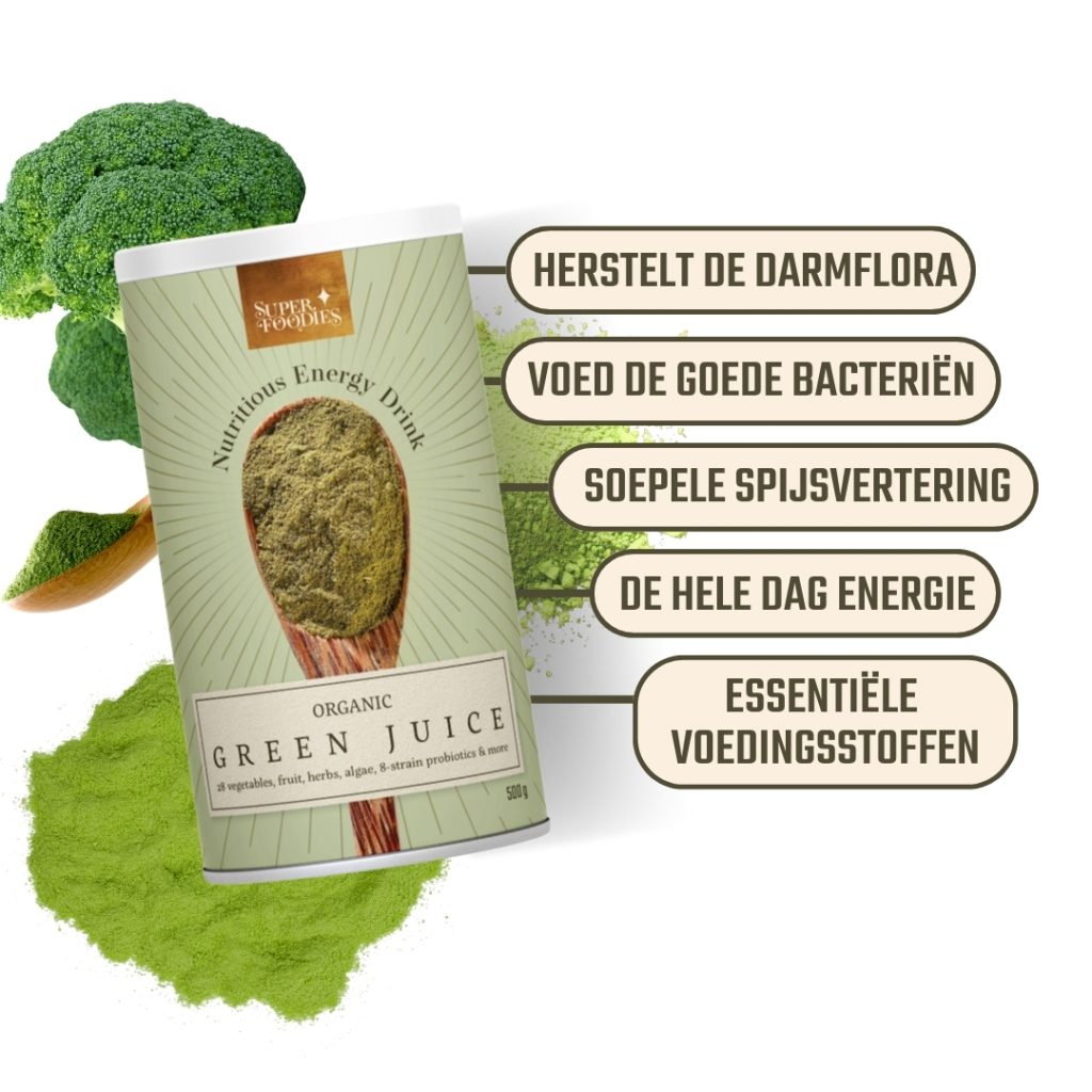 Green Juice bevat biologische vezels uit superfoods zoals camu camu, lucuma en rode biet.