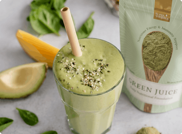 Green Juice bevat 24 µg Vitamine B12, je ‘energievitamine’, die bijdraagt aan een normaal energieleverend metabolisme. Vitamine C (450 mg) draagt bij aan de vermindering van vermoeidheid en moeheid.
