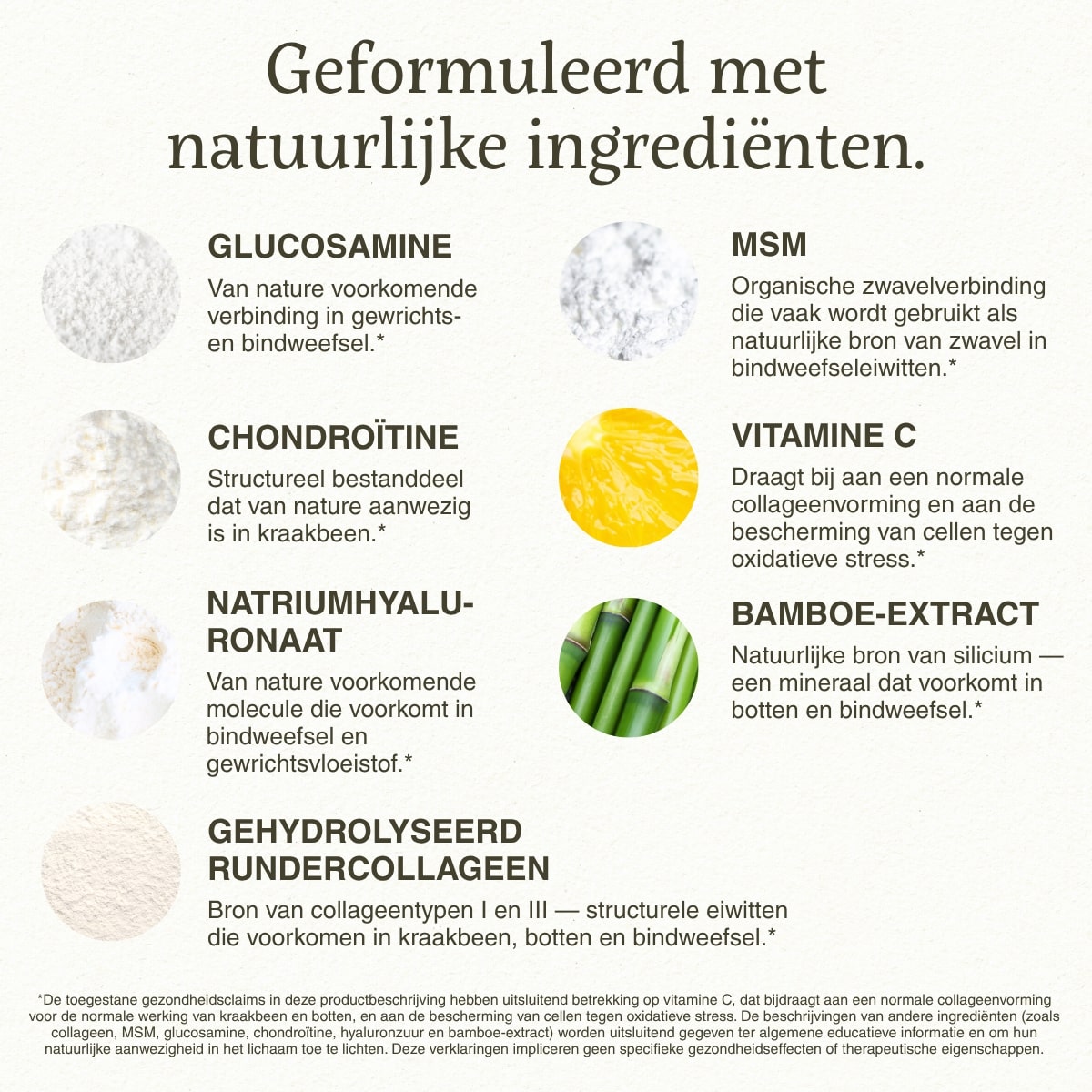 Daarnaast bevat de formule bamboe-extract, MSM, glucosamine en chondroïtine — voedingsstoffen die van nature in het lichaam voorkomen.