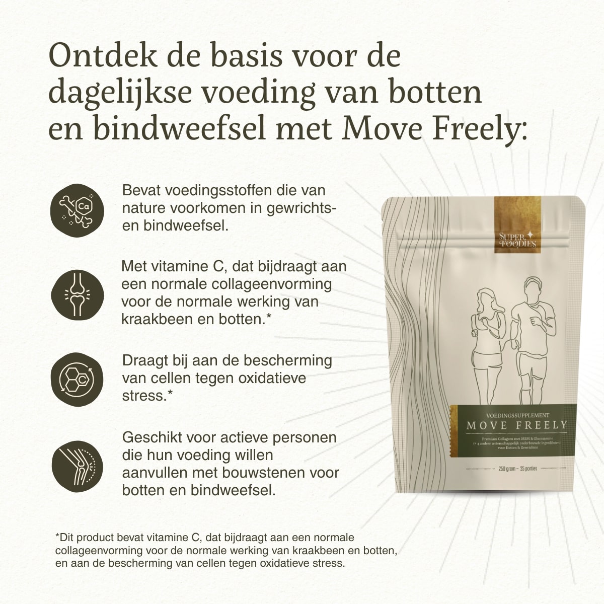 Move Freely is bedoeld als aanvulling op een gezonde voeding en leefstijl, niet als vervanging daarvan.
